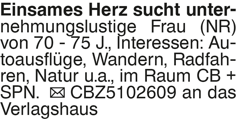 Einsames Herz sucht unter Einsames Herz sucht unternehmungslustige Frau (NR) von 70 - 75 J., Interessen: Autoausflüge, Wandern, Radfahren, Natur u.a., im Raum CB + SPN. CBZ5102609 an das Verlagshaus