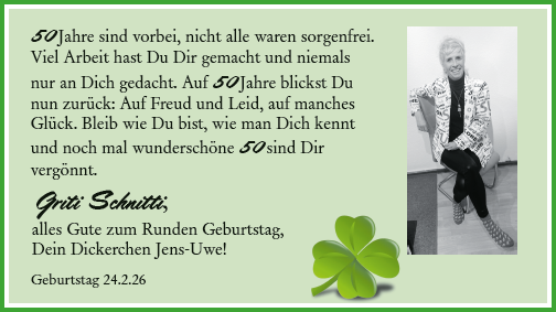 50. Geburtstag MA 50 Jahre sind vorbei, nicht alle waren sorgenfrei. Viel Arbeit hast Du Dir gemacht und niemals nur an Dich gedacht. Auf 50 Jahre blickst Du nun zurück: Auf Freud und Leid, auf manches Glück. Bleib wie Du bist, wie man Dich kennt und noch mal wunderschöne 50 sind Dir vergönnt. Griti Schnitti, alles Gute zum Runden Geburtstag, Dein Dickerchen Jens-Uwe! Geburtstag 24.2.26Das könnte Sie auch interessieren