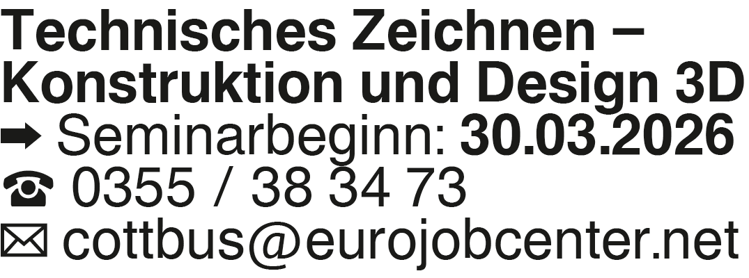 Technisches Zeichnen # Konstruktion Technisches Zeichnen # Konstruktion und Design 3D Seminarbeginn: 30.03.2026 0355 / 38 34 73 cottbus@eurojobcenter.net