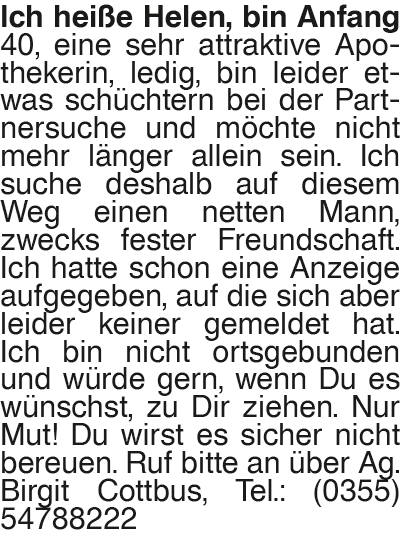 Helen, bin Anfang 40 Ich heiße Helen, bin Anfang 40, eine sehr attraktive Apothekerin, ledig, bin leider etwas schüchtern bei der Partnersuche und möchte nicht mehr länger allein sein. Ich suche deshalb auf diesem Weg einen netten Mann, zwecks fester Freundschaft. Ich hatte schon eine Anzeige aufgegeben, auf die sich aber leider keiner gemeldet hat. Ich bin nicht ortsgebunden und würde gern, wenn Du es wünschst, zu Dir ziehen. Nur Mut! Du wirst es sicher nicht bereuen. Ruf bitte an über Ag. Birgit Cottbus, Tel.: (0355) 54788222Das könnte Sie auch interessieren