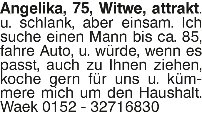 Angelika, 75, Witwe, attr Angelika, 75, Witwe, attrakt. u. schlank, aber einsam. Ich suche einen Mann bis ca. 85, fahre Auto, u. würde, wenn es passt, auch zu Ihnen ziehen, koche gern für uns u. kümmere mich um den Haushalt. Waek 0152 - 32716830Das könnte Sie auch interessieren
