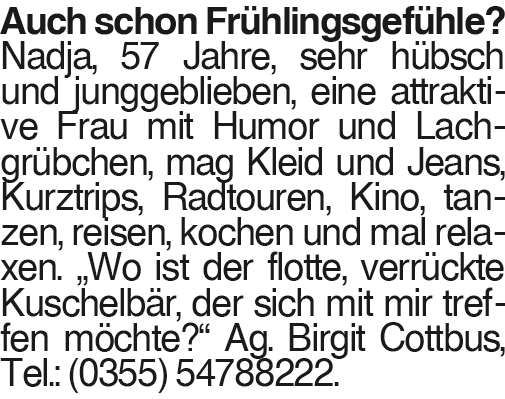 Nadja, 57 Jahre Auch schon Frühlingsgefühle? Nadja, 57 Jahre, sehr hübsch und junggeblieben, eine attraktive Frau mit Humor und Lachgrübchen, mag Kleid und Jeans, Kurztrips, Radtouren, Kino, tanzen, reisen, kochen und mal relaxen. Wo ist der flotte, verrückte Kuschelbär, der sich mit mir treffen möchte? Ag. Birgit Cottbus, Tel.: (0355) 54788222.Das könnte Sie auch interessieren