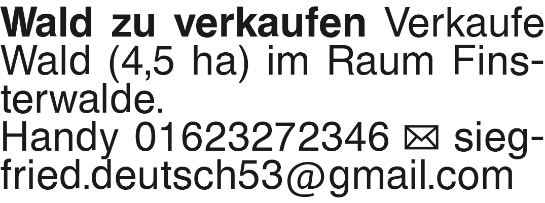 Wald zu verkaufen Verkauf Verkaufe Wald (4,5 ha) im Raum Finsterwalde. Handy 01623272346 siegfried.deutsch53@gmail.comDas könnte Sie auch interessieren