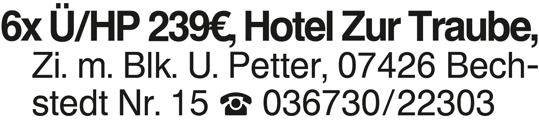 6x Ü/HP 239 EUR, Hotel Zu 6x Ü/HP 239 EUR, Hotel Zur Traube, Zi. m. Blk. U. Petter, 07426 Bech-stedt Nr. 15 036730/22303Kontakt