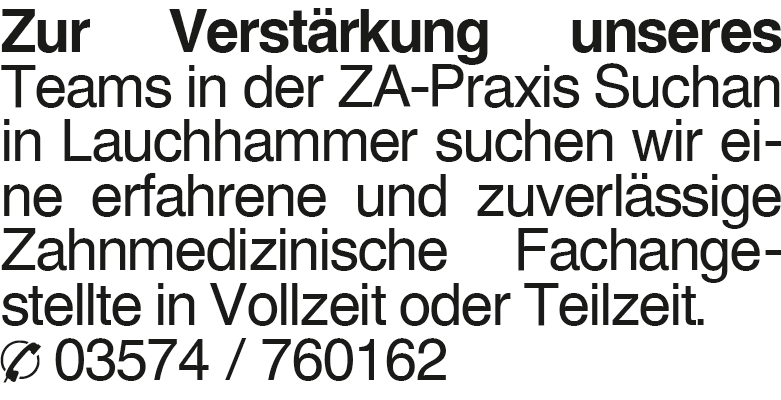 Zur Verstärkung unseres T Zur Verstärkung unseres Teams in der ZA-Praxis Suchan in Lauchhammer suchen wir eine erfahrene und zuverlässige Zahnmedizinische Fachangestellte in Vollzeit oder Teilzeit. 03574 / 760162