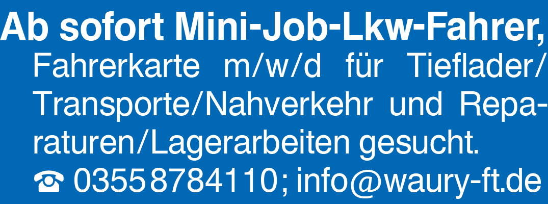 Ab sofort Mini-Job-Lkw-Fahrer, Fahrer... Ab sofort Mini-Job-Lkw-Fahrer, Fahrerkarte m/w/d für Tieflader/ Transporte/Nahverkehr und Repa- raturen/Lagerarbeiten gesucht. 0355 8784110 ; info@waury-ft.deKontakt
