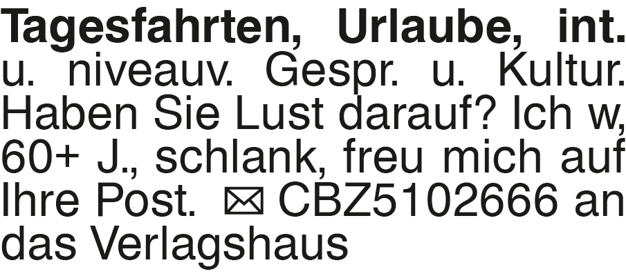 Tagesfahrten, Urlaube, in Tagesfahrten, Urlaube, int. u. niveauv. Gespr. u. Kultur. Haben Sie Lust darauf? Ich w, 60+ J., schlank, freu mich auf Ihre Post. CBZ5102666 an das VerlagshausDas könnte Sie auch interessieren