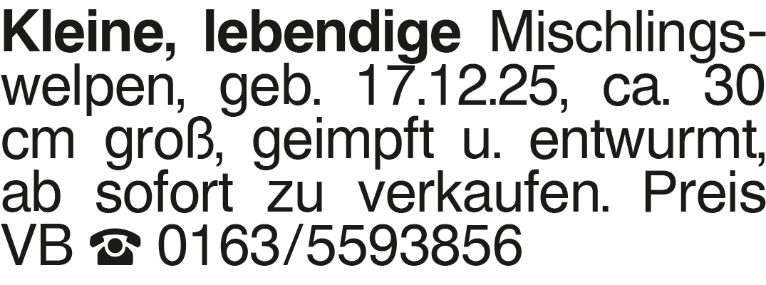 Kleine, lebendige Mischli Kleine, lebendige Mischlingswelpen, geb. 17.12.25, ca. 30 cm groß, geimpft u. entwurmt, ab sofort zu verkaufen. Preis VB 0163/5593856Das könnte Sie auch interessieren