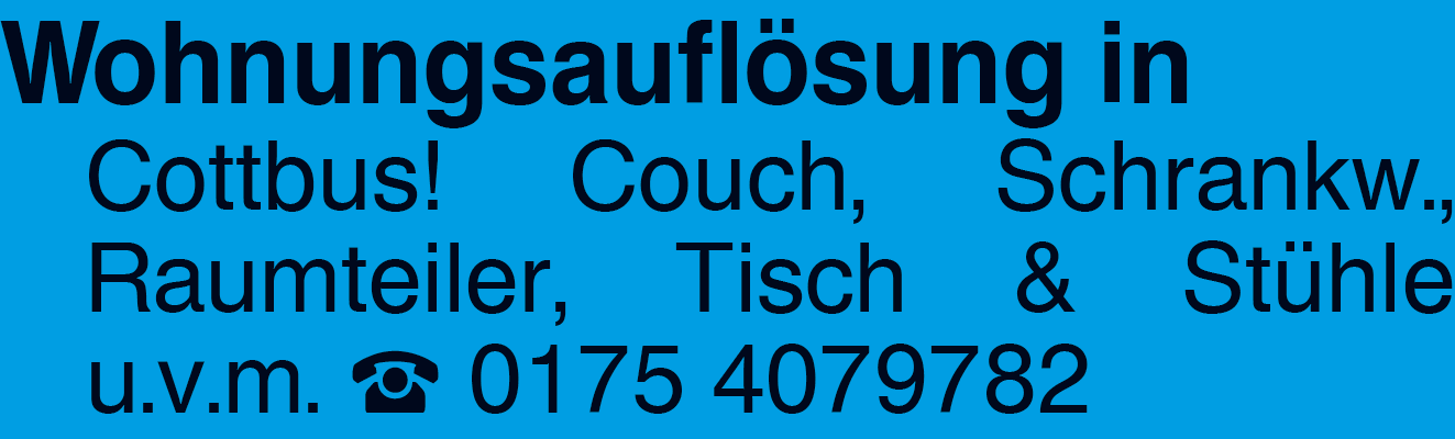 Wohnungsauflösung in Cott Wohnungsauflösung in Cottbus! Couch, Schrankw., Raumteiler, Tisch & Stühle u.v.m. 0175 4079782Das könnte Sie auch interessieren