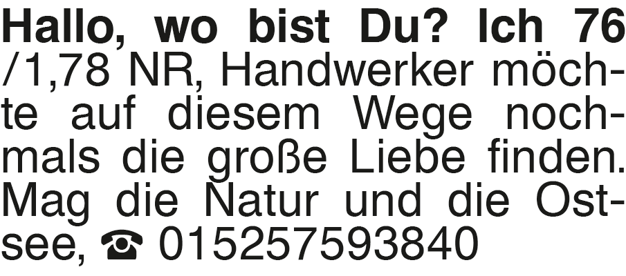 Hallo, wo bist Du? Ich 76 Hallo, wo bist Du? Ich 76 /1,78 NR, Handwerker möchte auf diesem Wege nochmals die große Liebe finden. Mag die Natur und die Ostsee, 015257593840Das könnte Sie auch interessieren