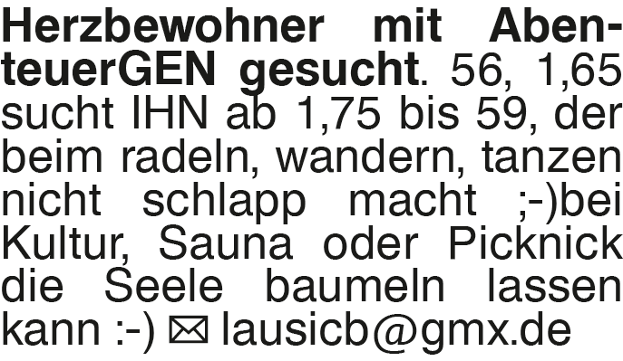 Herzbewohner mit Abenteue 56, 1,65 sucht IHN ab 1,75 bis 59, der beim radeln, wandern, tanzen nicht schlapp macht ;-) bei Kultur, Sauna oder Picknick die Seele baumeln lassen kann. Anwort erwünscht lausicb@gmx.de