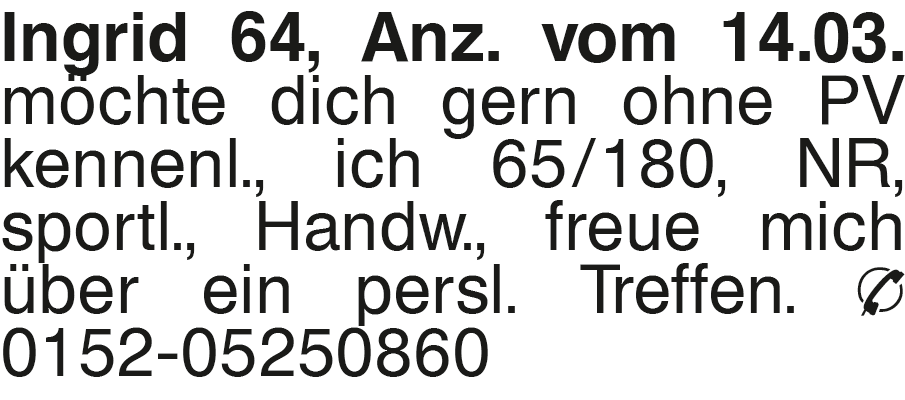 Ingrid 64, Anz. vom 14.03 möchte dich gern ohne PV kennenl., ich 65/180, NR, sportl., Handw., freue mich über ein persl. Treffen. Tel. 0152-05250860Das könnte Sie auch interessieren