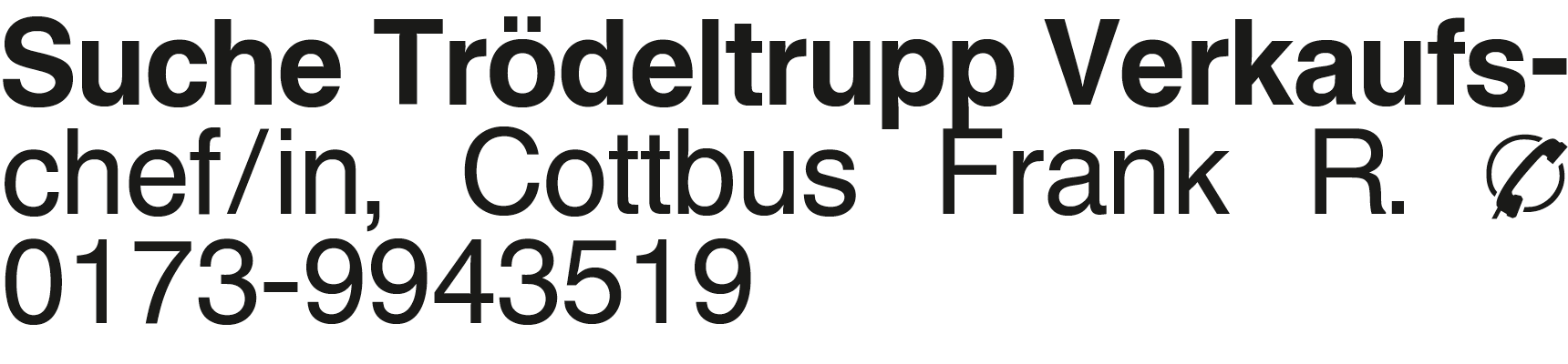 Suche Trödeltrupp Verkauf Suche Trödeltrupp Verkaufschef/in, Cottbus Frank R. 0173-9943519Das könnte Sie auch interessieren