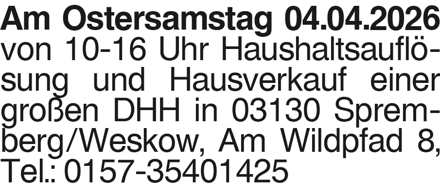 Am Ostersamstag 4.4.2026 Am Ostersamstag 04.04.2026 von 10-16 Uhr Haushaltsauflösung und Hausverkauf einer großen DHH in 03130 Spremberg/Weskow, Am Wildpfad 8, Tel.: 0157-35401425Das könnte Sie auch interessieren