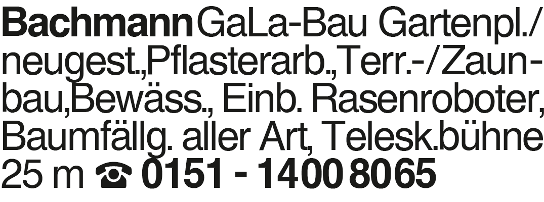 Bachmann GaLa-Bau Gartenpl. Bachmann GaLa-Bau Gartenpl./ neugest.,Pflasterarb.,Terr.-/Zaunbau,Bewäss., Einb. Rasenroboter, Baumfällg. aller Art, Telesk.bühne 25 m 0151 - 14 00 80 65Das könnte Sie auch interessieren