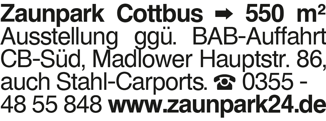 Zaunpark Cottbus 550 m2 Ausstellung Zaunpark Cottbus 550 m2 Ausstellung ggü. BAB-Auffahrt CB-Süd, Madlower Hauptstr. 86, auch Stahl-Carports. 0355 - 48 55 848 www.zaunpark24.deDas könnte Sie auch interessieren