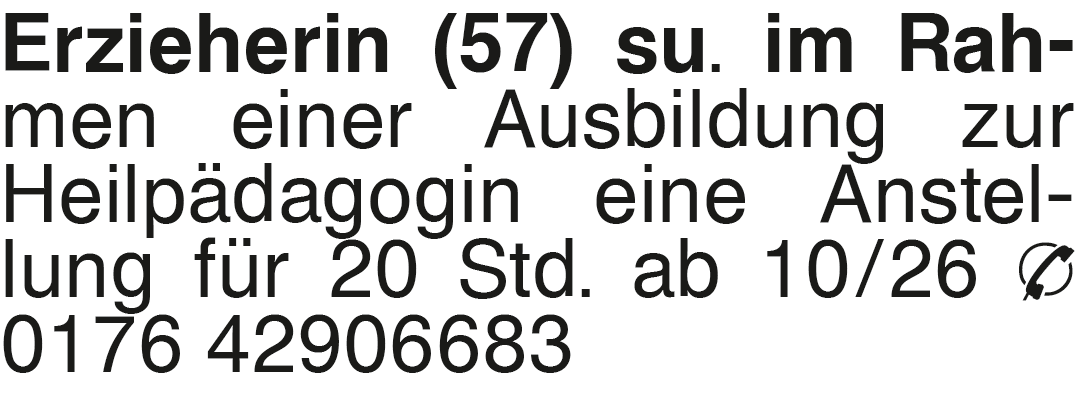 Erzieherin (57) su. im Ra Erzieherin (57) su. im Rahmen einer Ausbildung zur Heilpädagogin eine Anstellung für 20 Std. ab 10/26 0176 42906683Kontakt