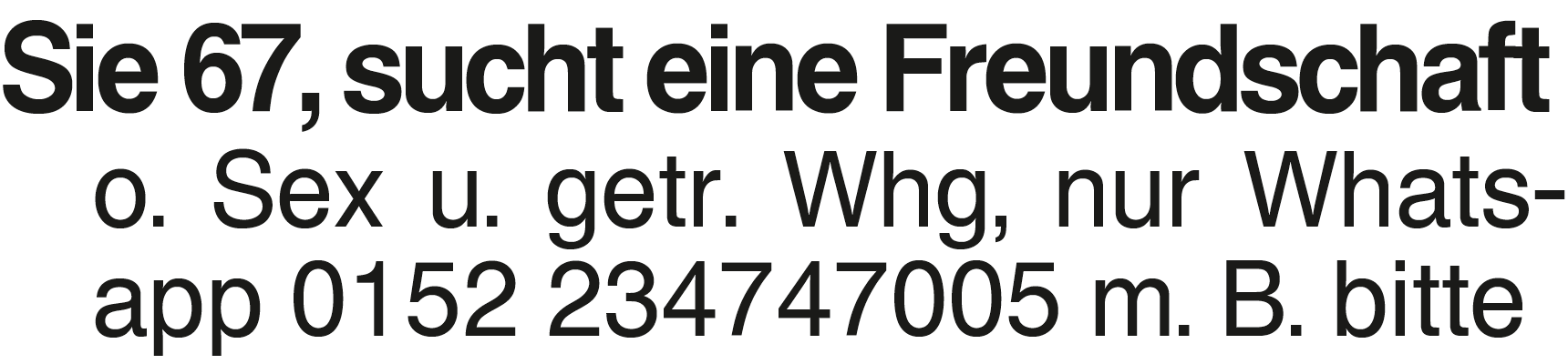 Sie 67, sucht eine Freund Sie 67, sucht eine Freundschaft o. Sex u. getr. Whg, nur Whatsapp 0152 234747005 m. B. bitteDas könnte Sie auch interessieren