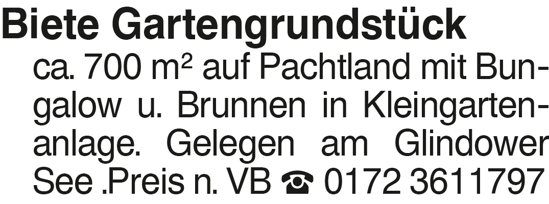 Biete Gartengrundstück ca Biete Gartengrundstück ca. 700 m2 auf Pachtland mit Bungalow u. Brunnen in Kleingartenanlage. Gelegen am Glindower See .Preis n. VB 0172 3611797