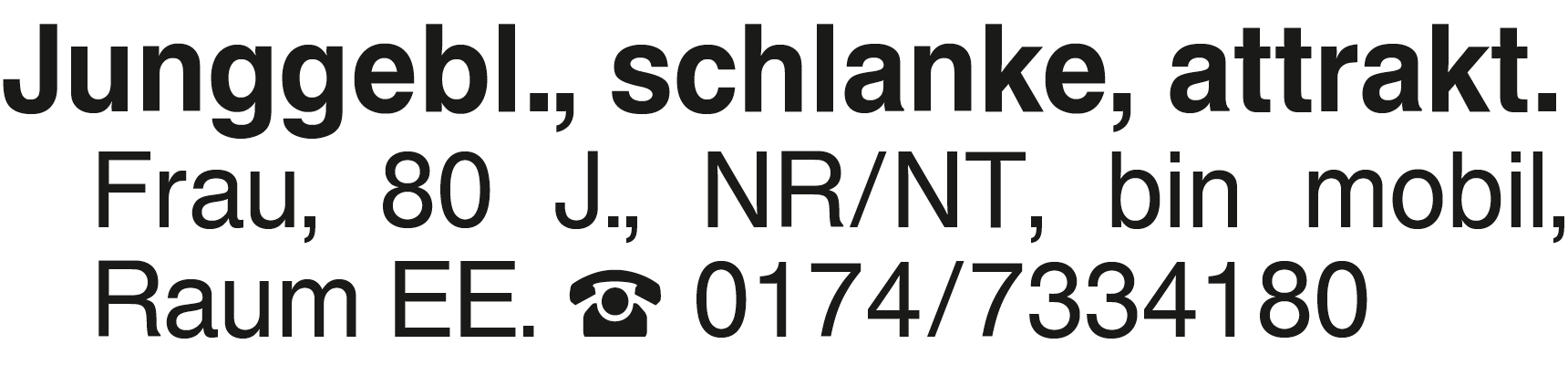Junggebl., schlanke, attr Junggebl., schlanke, attrakt. Frau, 80 J., NR/NT, bin mobil, Raum EE. 0174/7334180Das könnte Sie auch interessieren