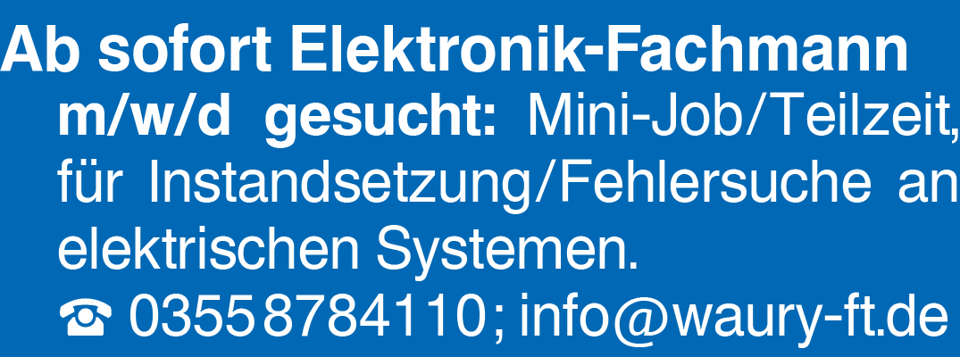Ab sofort Elektronik-Fachmann Ab sofort Elektronik-Fachmann m/w/d gesucht: Mini-Job/Teilzeit, für Instandsetzung/Fehlersuche an elektrischen Systemen. 0355 8784110 ; info@waury-ft.deKontakt