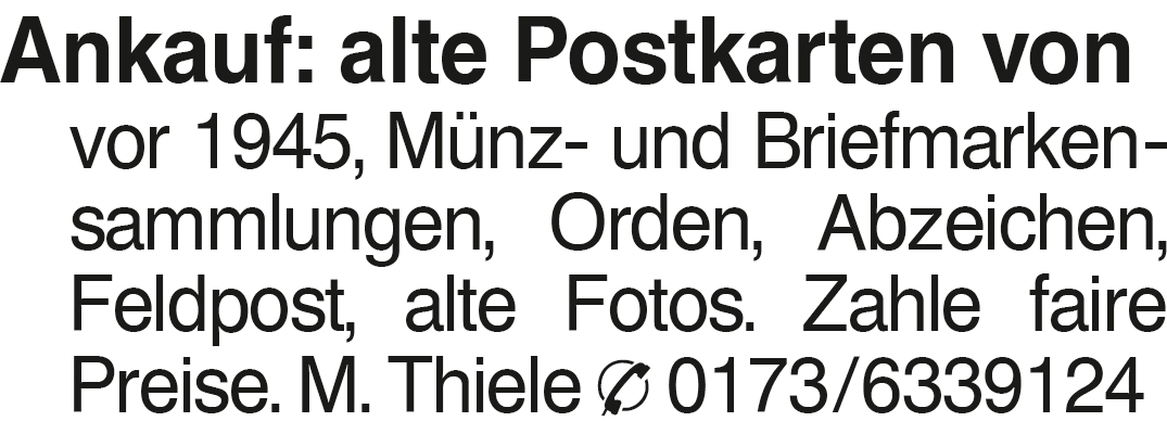 Ankauf von Postkarten, Mü Ankauf: alte Postkarten von vor 1945, Münz- und Briefmarkensammlungen, Orden, Abzeichen, Feldpost, alte Fotos. Zahle faire Preise. M. Thiele 0173/6339124