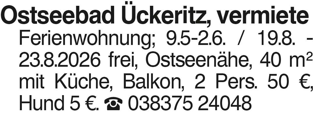 Ostseebad Ückeritz, Vermi Ostseebad Ückeritz, vermiete Ferienwohnung; 9.5-2.6. / 19.8. -23.8.2026 frei, Ostseenähe, 40 m2 mit Küche, Balkon, 2 Pers. 50 EUR, Hund 5 EUR. 038375 24048Das könnte Sie auch interessieren