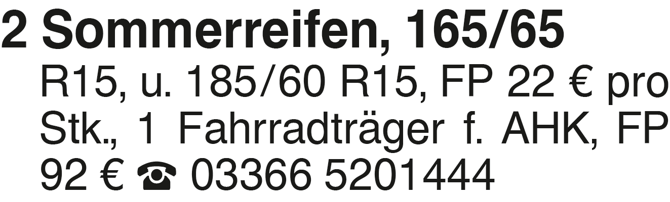 2 Sommerreifen, 165/65 R1 2 Sommerreifen, 165/65 R15, u. 185/60 R15, FP 22 EUR pro Stk., 1 Fahrradträger f. AHK, FP 92 EUR 03366 5201444Das könnte Sie auch interessieren
